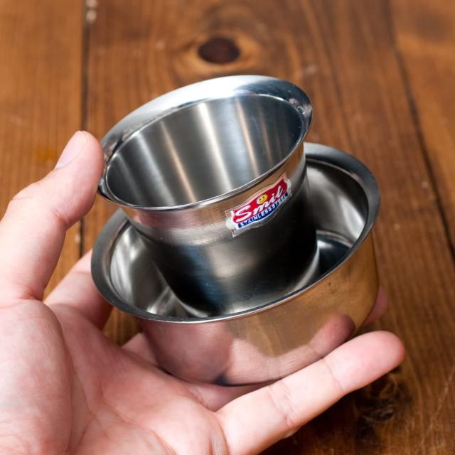 こちらは、コーヒーカップとソーサーがセットになっているので、すぐに南インド式コーヒーを楽しめます。ステンレス製で、周りの風景を写しだしてくれるので、場所によってさまざまな表情を見せてくれます。