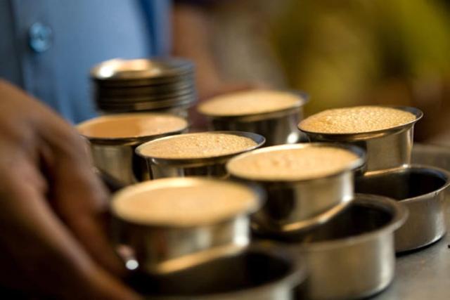 南インドの食堂では給仕してくれる係の人がソーサーとカップをたくみに使ってコーヒーによくエアーを含ませてくれます。