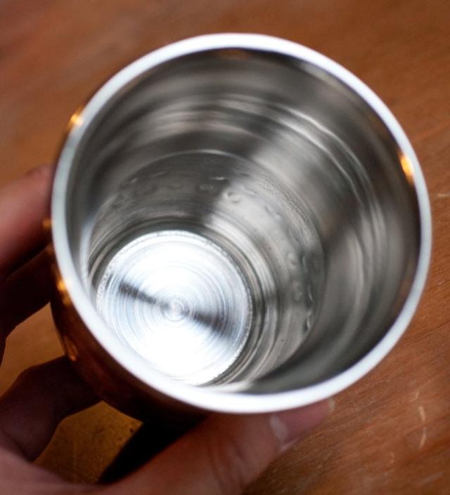 外側の銅は、鎚で手打ちして作られています。槌目により立体感が出て、光の加減で表情を変えてくれるので、とても見た目が良いです。さらに、槌目の凹凸には滑り止め効果もあり手触りも優しいコップです