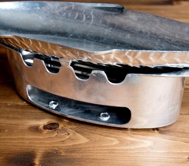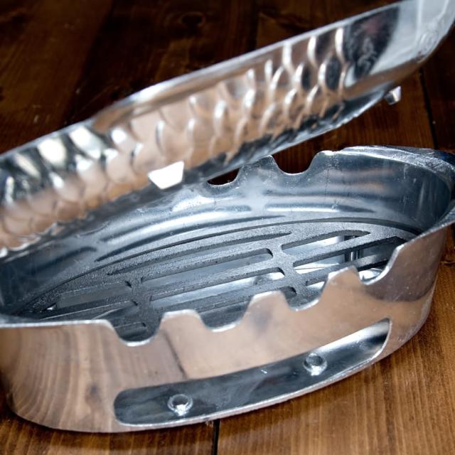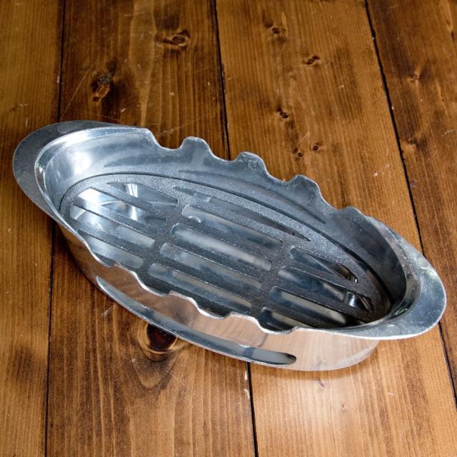 こちらのフィッシュパンは、燃料が炭。なので、アウトドアで料理を保温や調理することができます。サイズは全長約40cm程度と、スズキなど大方の魚も収まる、十分なサイズ感です。事前に調理した料理を、外で保温しながら食べてもらう為にも使えますし、アルミホイルで包んでそのまま調理など、さまざま用途に使えます。