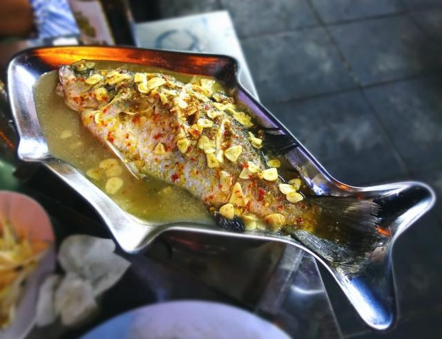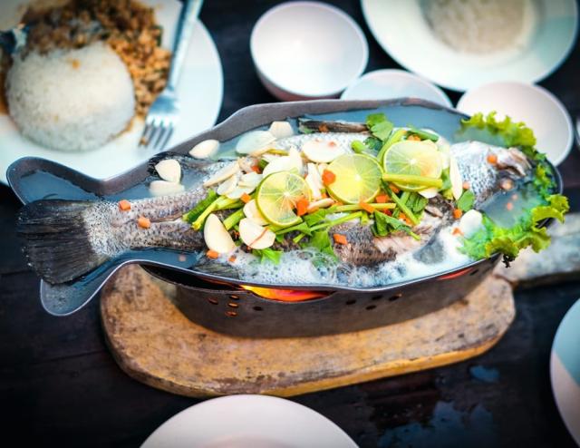 アウトドアで熱々の魚料理が食べられる。炭火のフィッシュパンです。