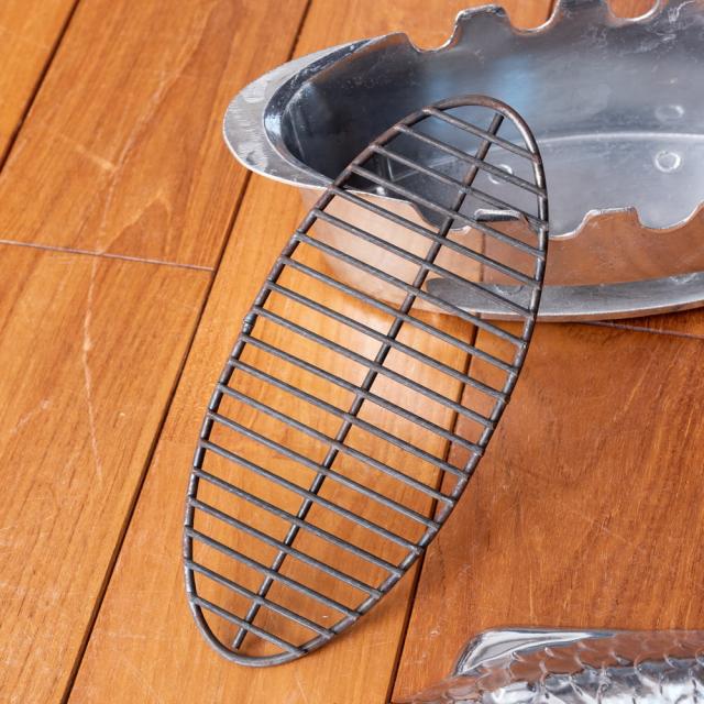 主に煮魚を調理するのにおすすめな、お魚の形をしたフィッシュパン。そして、それを温める炭を入れる下部の、炭入れ台もセットとなっております。■アウトドアで熱々の料理を