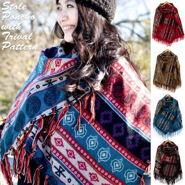 ふわふわの起毛が暖かい ネイティブ柄のストール風 ボタンポンチョ / ポンチョ、ウール ポンチョ、ネパール ポンチョ TIRAKITA(ティラキタ) エスニック衣料 【エスニック・アジアン衣料