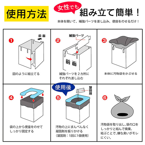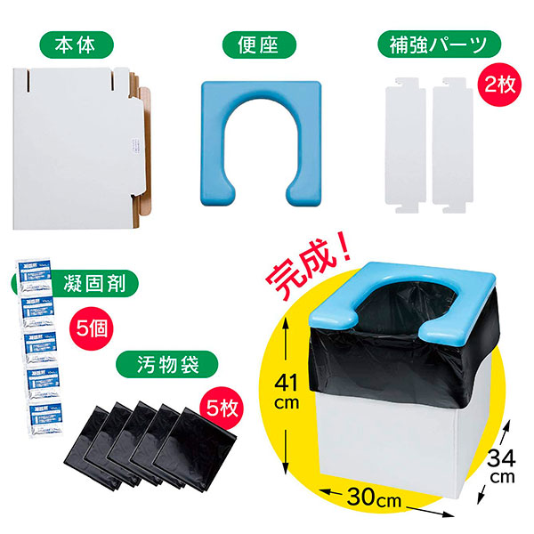 セット内容:便座×1個、本体×1個、補強パーツ×2個、凝固剤×5個、汚物袋×5枚
