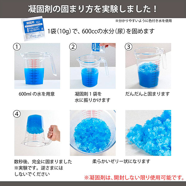 凝固剤目安凝固剤1袋(10g)で約600ccの尿を吸収します。 50袋入り。