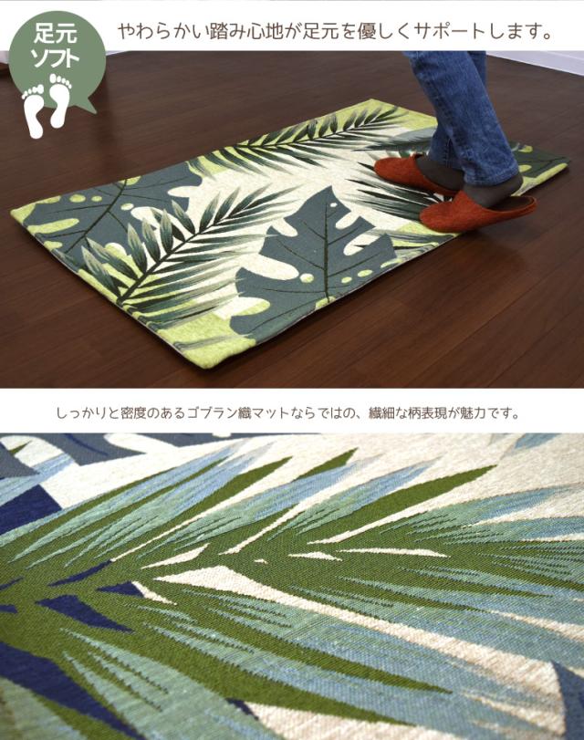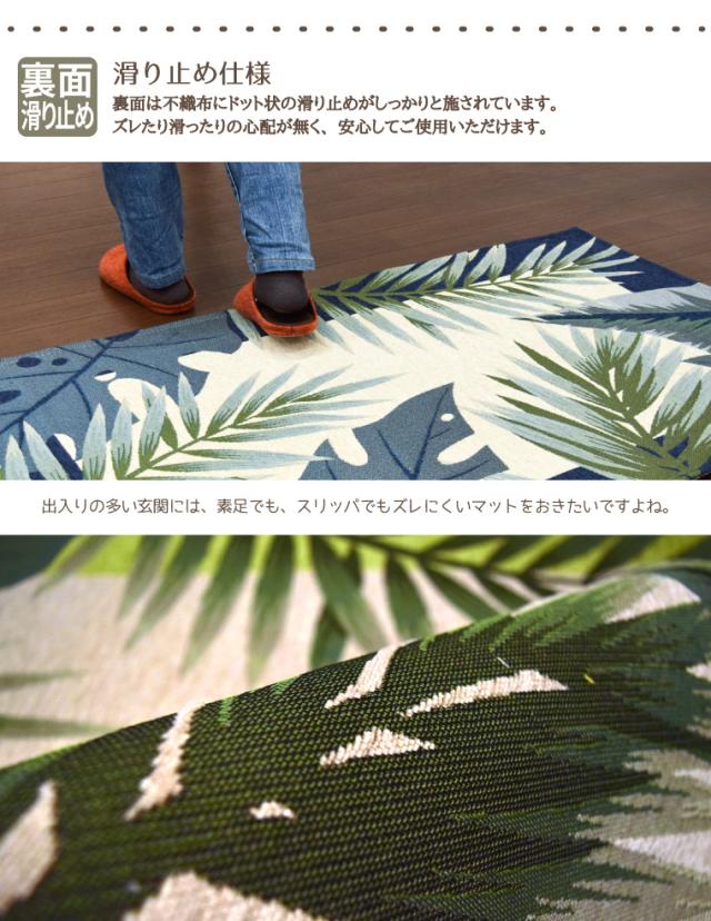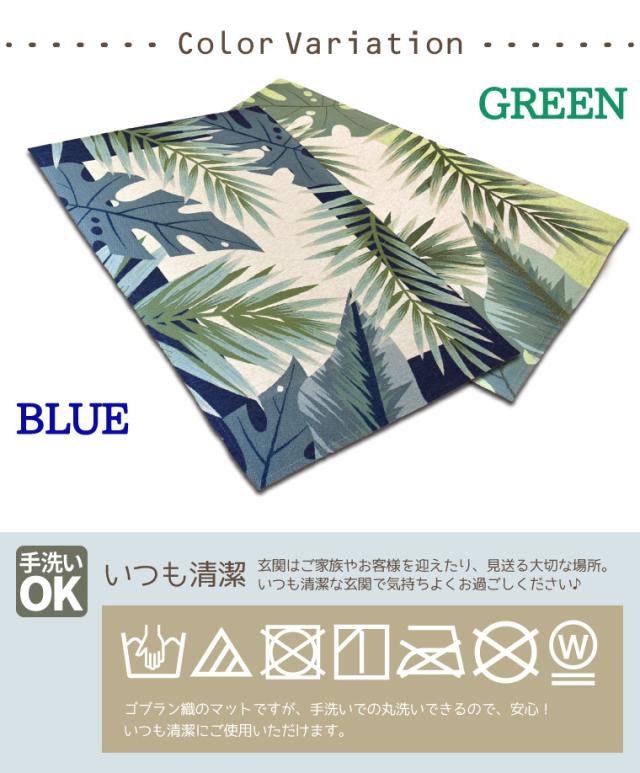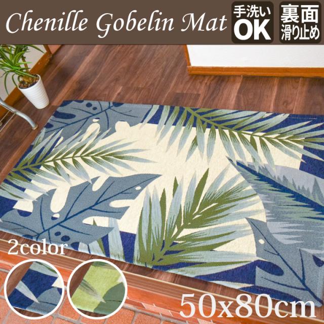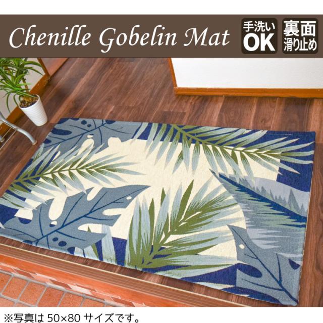 マット 玄関マット オアシス 約50×80cm リーフ柄 滑り止め 玄関 シェニール ゴブラン織り ブルー グリーン 青 緑 室内 屋内 エントランス おしゃれ 爽やか 在宅 勤務