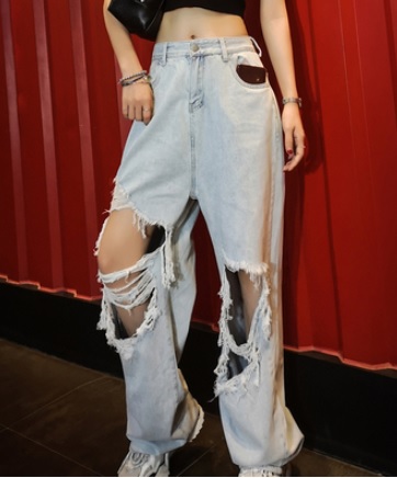 デニムパンツ Gパン ジーンズ ダメージジーンズ ハイウェストパンツ コットン らくちん ロング丈 ゆったり ブルー かっこいい 春夏 10代 20代 30代 お出かけ デート 着まわし 大人女子 カジュアル シンプル トレンド