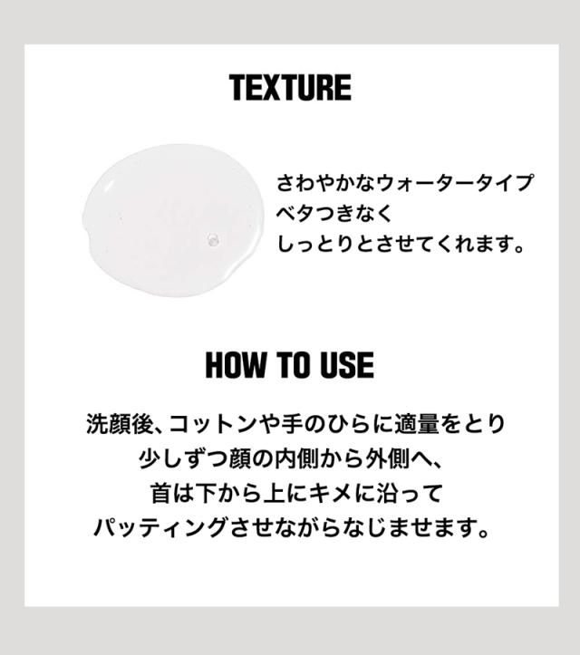 洗顔後、コットンまたは手のひらに取り、適量を肌のキメにそって塗り伸ばし、軽く叩いて馴染ませます。