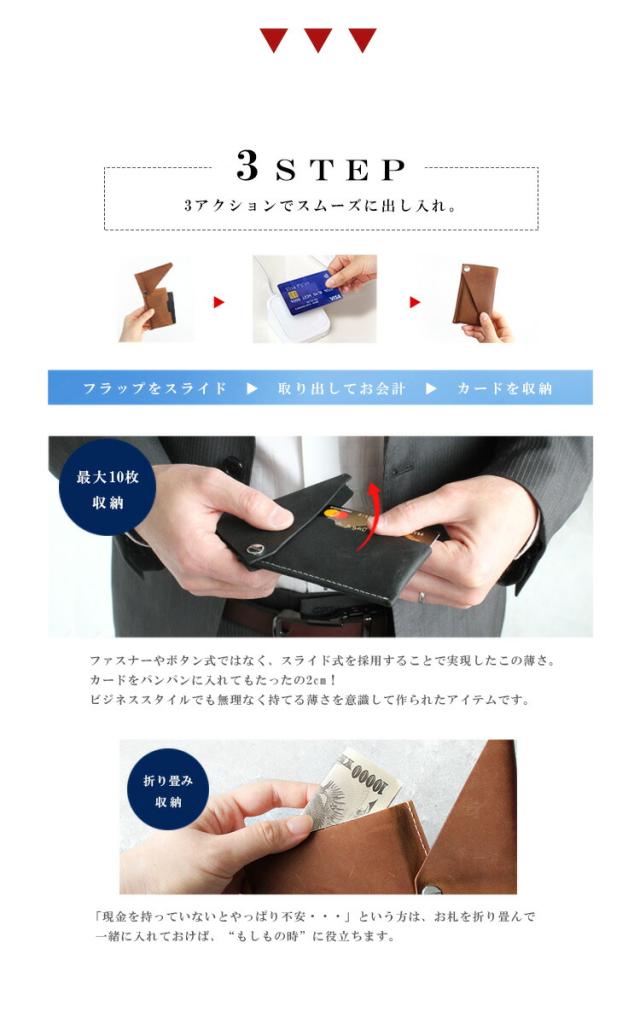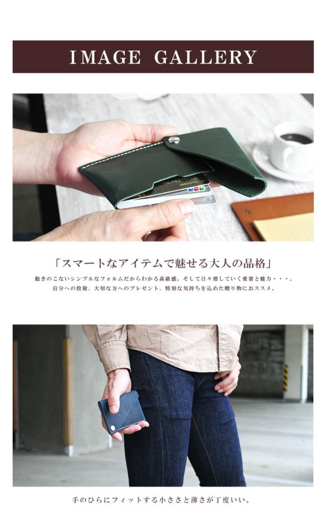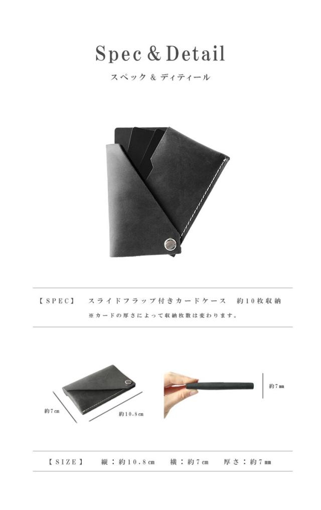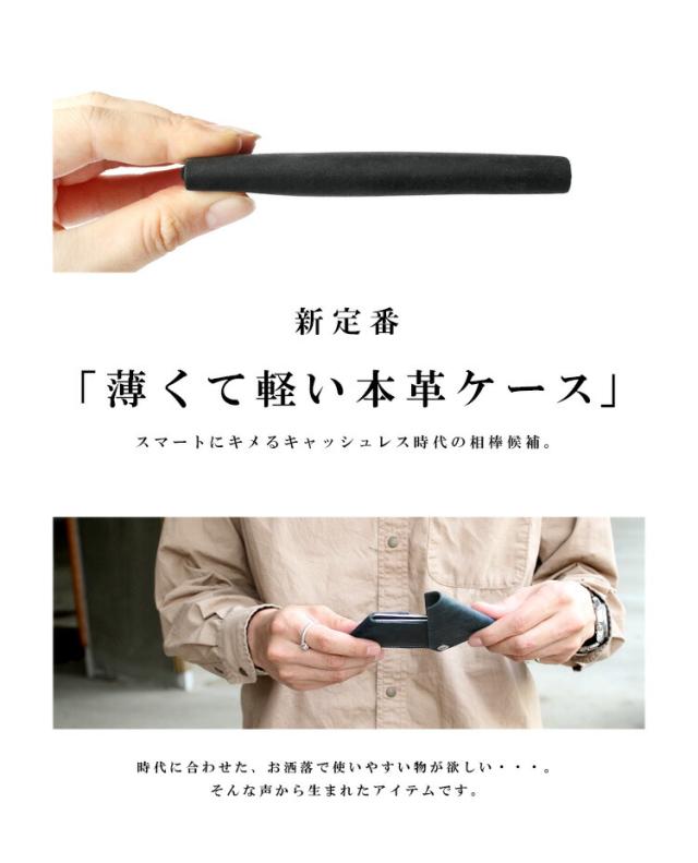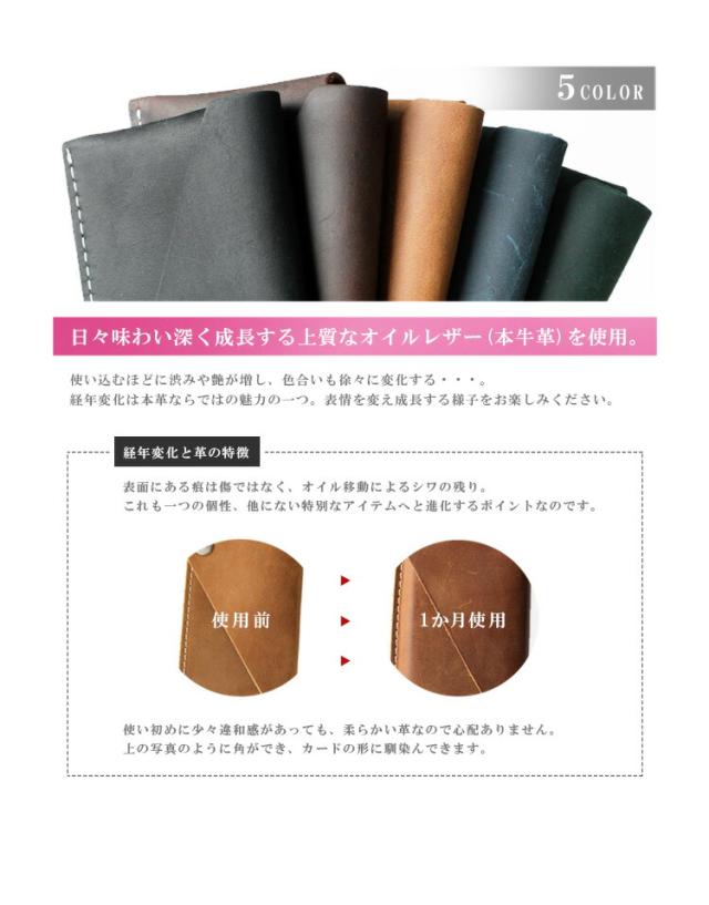 しっとりとした質感のオイルレザーを使用したカードケースです。ファスナーやボタン式ではなく、スライド式をさいようすることで薄さとデザイン性を両立させました。使い込むほどに風合いが増していきますので長く使っていく楽しみもあります。
