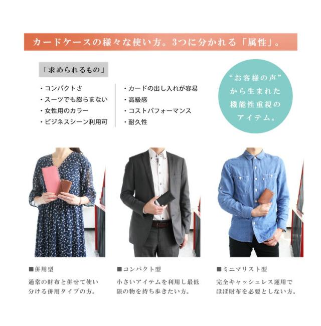 ビジネスでもプライベートでも使用可能なおしゃれなカード入れになっています。男女兼用のユニセックスデザインで学生、ビジネスマン、など幅広い層の方にお使いいただけます。