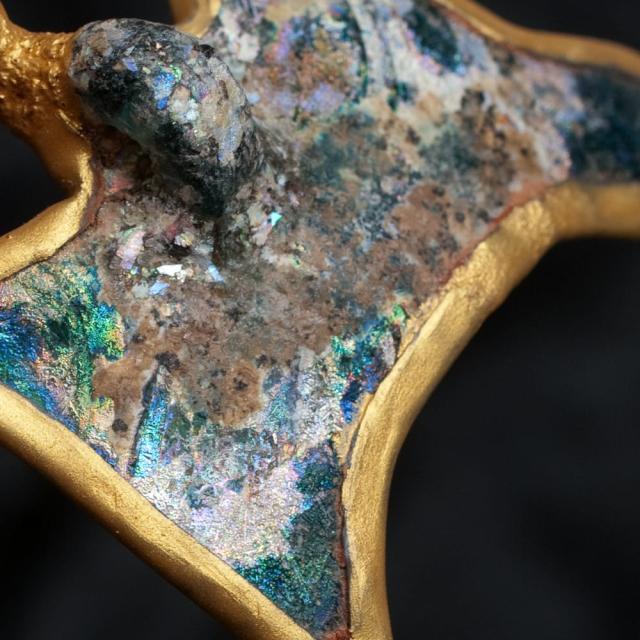 カラフルで星空の様な輝きを持つローマンガラスは、ローマ時代の人が使用したガラス製品が、遺物として土の下に埋まり、化学変化を起こして出来上がったものです。