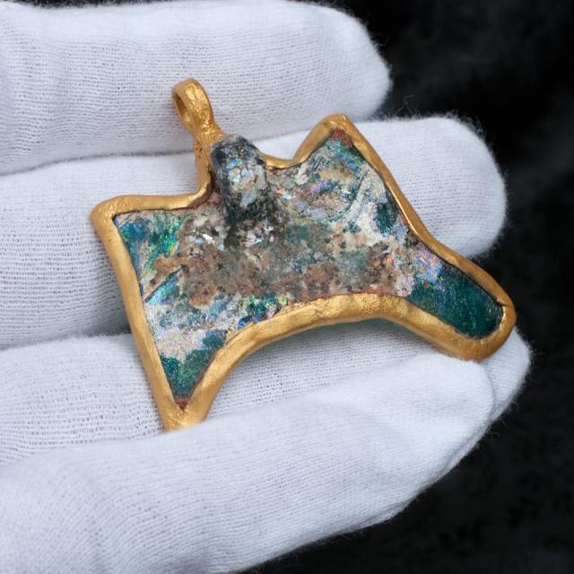 ローマンガラスとは、はるか昔、ローマ帝政開始の紀元前27年から、ローマ帝国の東西分裂(紀元後後395年)までの約5世紀間に、ローマ帝国内で製造・流通したガラス製品です。こちらのペンダントトップになっているローマンガラスは、東西文化の交流地点であった中央アジアと南アジアの交差点で出土したものです。遙かローマから、駱駝の隊商に載せられて、長旅の後に中央アジアと南アジアの交差点にたどり着きました。ローマから運ばれたガラスは古代の人たちに使用されたあと、何らかの理由で土の下に眠ったのだと思われます。