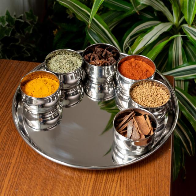 インドでカレーを食べるときに使うステンレス製の大皿。大皿の中にご飯を入れ、小皿の中に数種類のカレーを入れて使用します。うっすらと透かし模様がはいっていてデザイン性も優れた一枚です。■収納しやすい形です