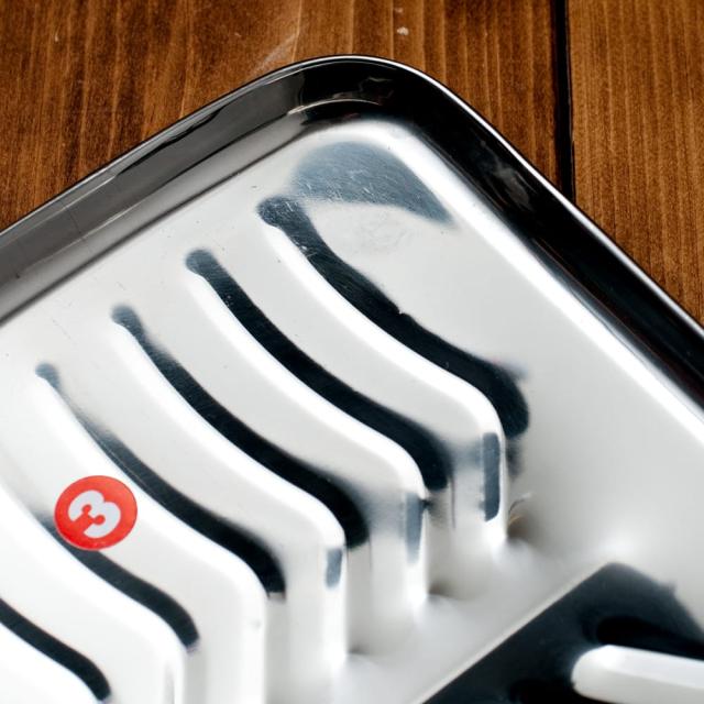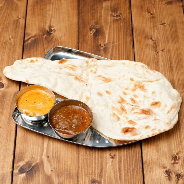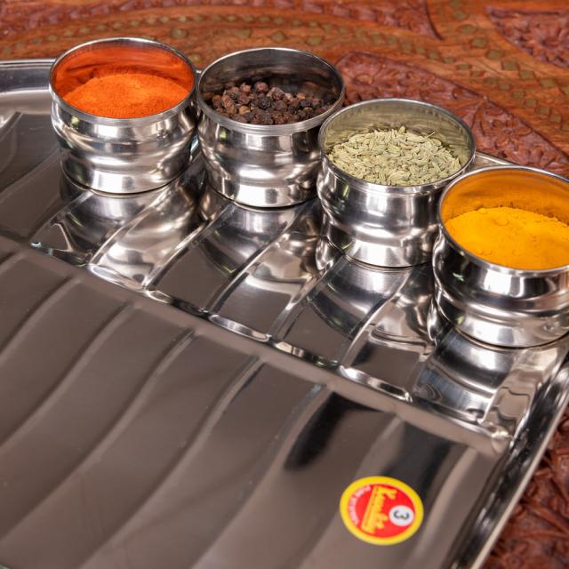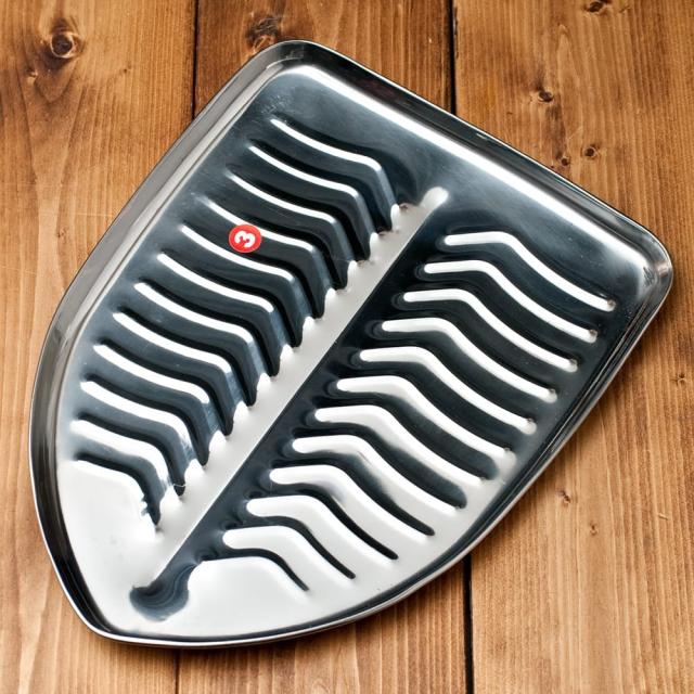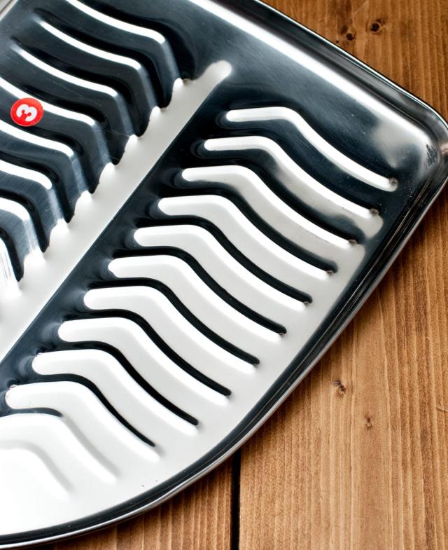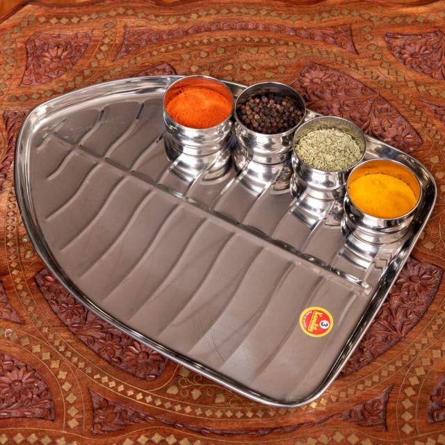 こちらの食器は、そんなバナナの葉っぱをモチーフにしたステンレス食器です。南インドで用いられているバナナの葉と、北インドで一般的に使われているステンレス食器。それぞれの魅力を融合したような製品です。本物のバナナの葉はなかなか手に入りませんが、こちらの食器なら南インド料理を出すときも雰囲気を損なわず、お手軽に料理を盛り付けることができます。