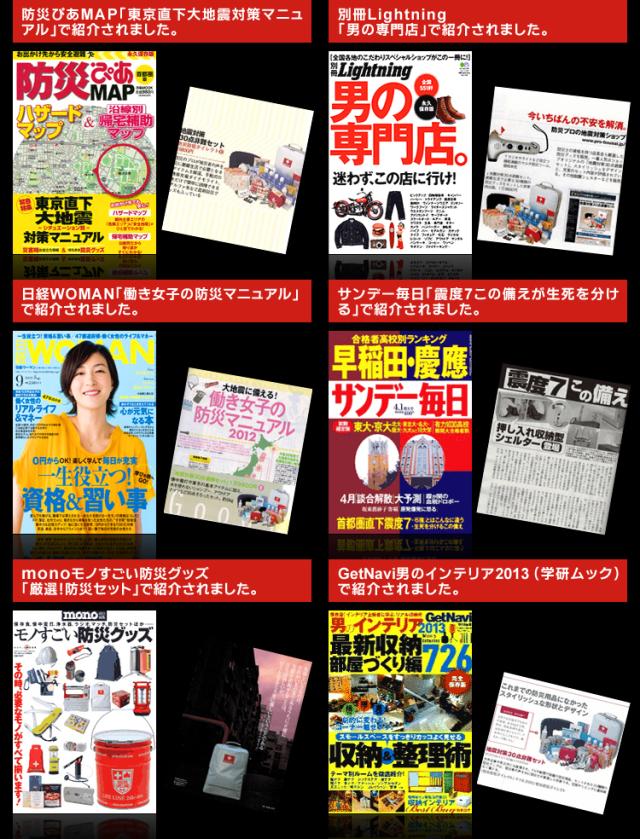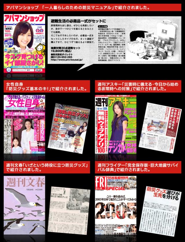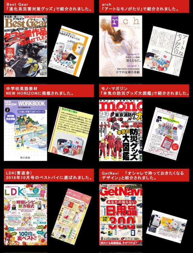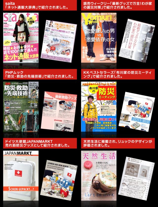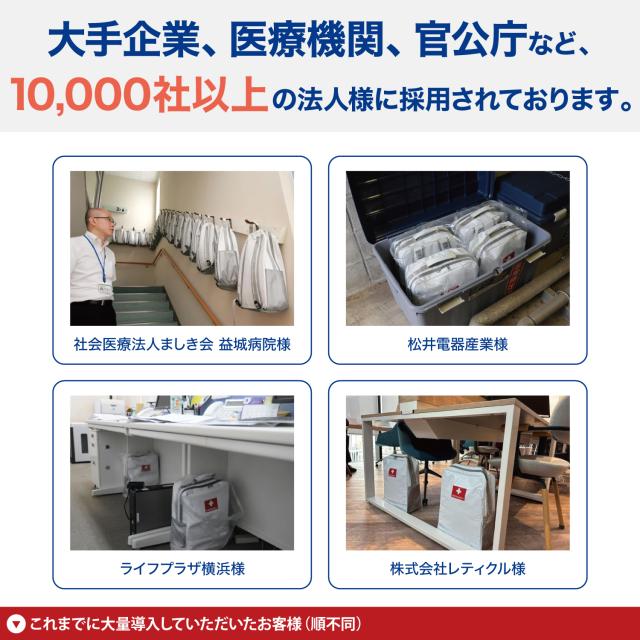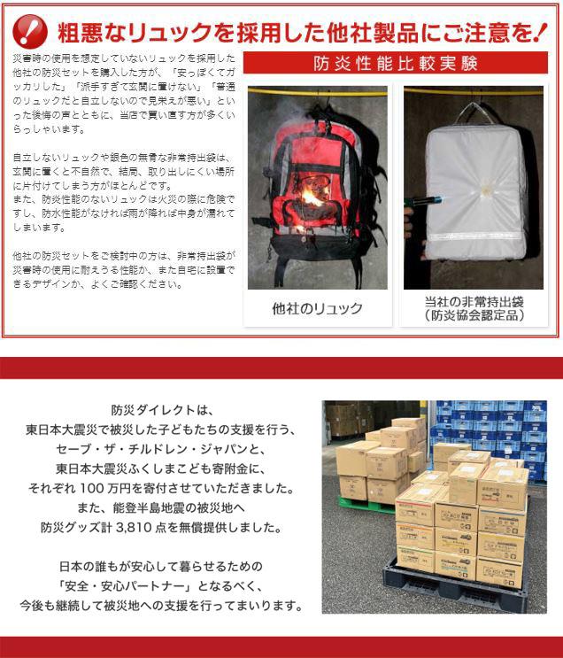 | 防炎製品事業者認定番号 | 財団法人日本防炎協会 認定事業所番号 N-1027(非常持出袋) |