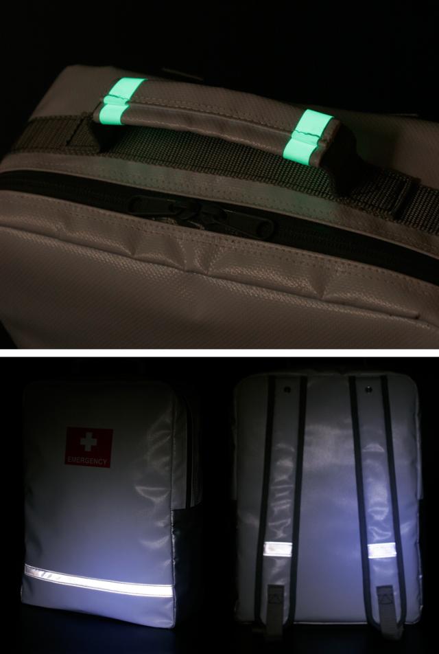 夜間の避難の安全性を高めるため、前面と肩ベルトに反射材付き。