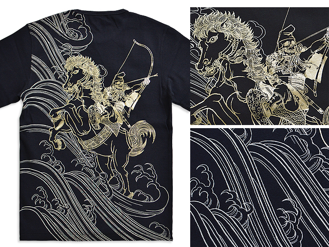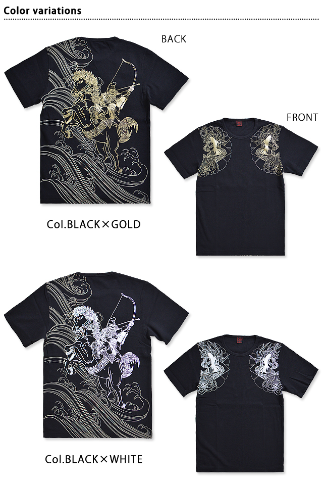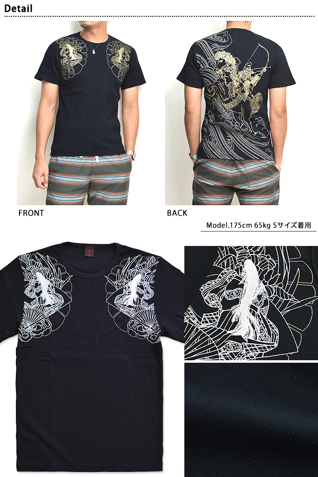 | 和の美意識を凝縮し、洋と引き合わせる。究極の和洋折衷を可能にしたクロップドヘッズさんから、 「那須与一柄テレコ半袖Tシャツ(1212-22)」のご紹介です。 与一は十あまる一、つまり十一男を示す通称です。 なお、与一を称した同時代人としては佐奈田与一、浅利与一がいます。 彼らと那須与一を合わせて「源氏の三与一」と呼ばれていました。 バックには、那須与一髑髏が馬に跨り、弓を引く姿が描かれています。 荒ぶる波をかき分けて疾走する、躍動感たっぷりの絵柄です。 フロント両肩には、十二単姿の女性を対にプリント。 刺青風のデザインですので、体にフィットするサイズ感で着用すれば、 絵柄がより立体的に浮かび上がること間違いなしです! カラーは、どちらもボディーカラーにブラックを採用。 ボディーには、フィット感のあるテレコ生地を使用しています。 | ||||||||||