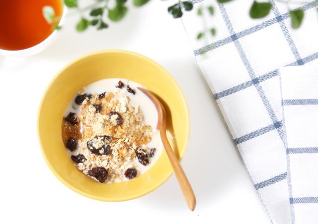 | 牛乳や植物性ミルク(豆乳・ライスドリンク・アーモンドドリンク・オーツドリンク)をかけたり、お好みのやわらかさに煮て、甘味料を加えたり、ヨーグルトやサラダのトッピングに。パンやお菓子作り(クッキーやスコーンなど)の材料にもおすすめです。 → 写真は 豆乳をかけ、レーズンやハチミツ、きな粉をトッピングしたものです。 | |||||||||||||||||