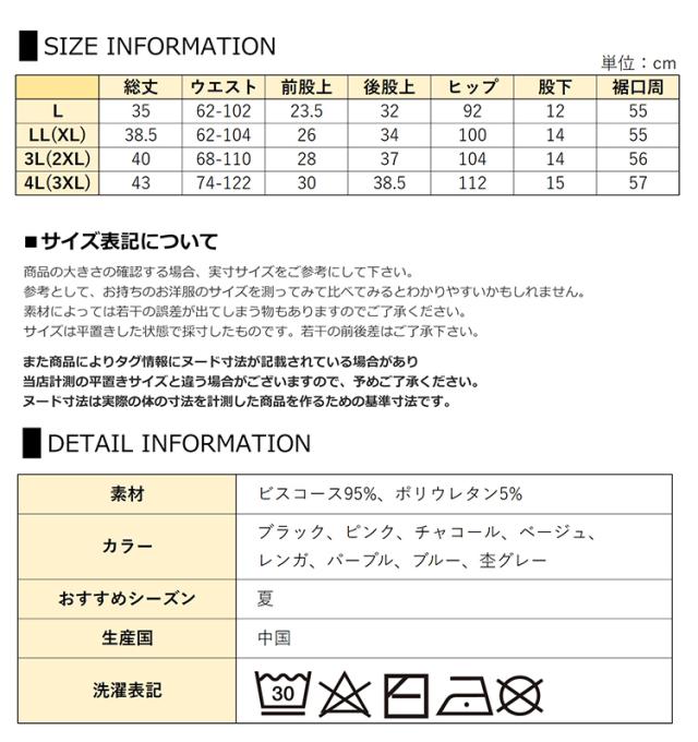 3L(2XL):総丈40 ウエスト68-110 前股上28 後股上37 ヒップ104 股下14 裾口周56