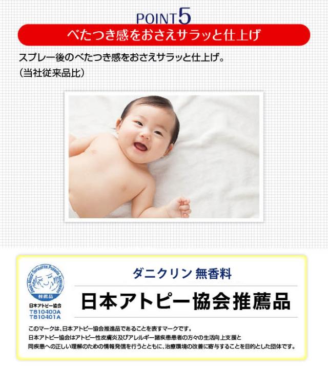 Point5スプレー後のべたつき感をおさえサラッと仕上げ。(当社従来品比)