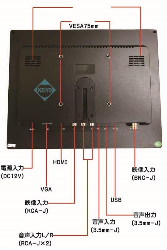 ■ 10.4インチTFT液晶モニター ASM-MNT104HVBR●10.4インチワイドTFT液晶採用本機はTFT液晶パネルを採用した、液晶モニターです。 最大表示解像度は、800×600になります。(1024×768サポート) ●5入力方式採用、幅広い用途に対応 HDMI入力・VGA入力・BNC入力・AV入力・USB入力の 計5入力端子を搭載。 アスペクト比4:3で監視用モニターとしてだけでなく 幅広い用途で、ご使用頂けます。 ●スピーカー内蔵 本機は本体背面に2個のステレオスピーカーを内蔵しています。 ●防犯・監視カメラ用にモニターに最適 本機はスマートで省スペースモデルなので、監視用、モニターに 最適なサイズです。 ●選べる設置方法 本機は、付属スタンドを使っての据え置き以外にも 別売りのVESA75×75mm準拠の取付金具を使う事で 壁面・天釣り設置も可能です。 ![]() ■ ASM-MNT104HVBR 各部名称![]() ![]() |