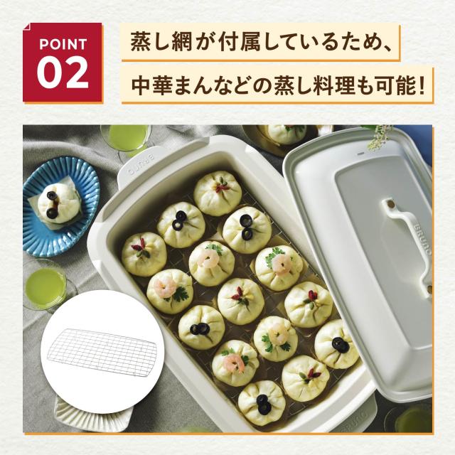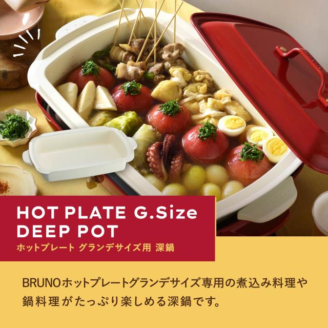 BRUNO(ブルーノ)からホットプレートグランデサイズ用深鍋が入荷。ホットプレートグランデサイズの上にセットして煮物やお鍋、蒸し料理が楽しめます。表面はセラミックコート加工により、傷や焦げがつきにくく、お手入れも簡単です。おでん、ポトフ、ボルシチ、アクアパッツァなど、様々な料理を作ることができます。