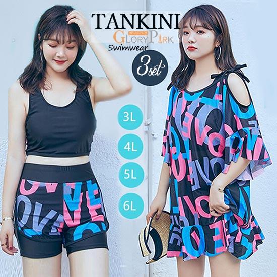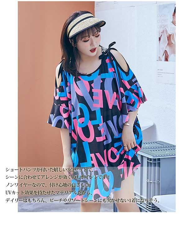 肩だし 3点セット ぽっちゃり 女性 セパレート 体型カバー 大きいサイズ ラッシュガード ミセス ママ水着 ショートパンツ スイミング ジム 20代 30代 40代 k5140zezec9