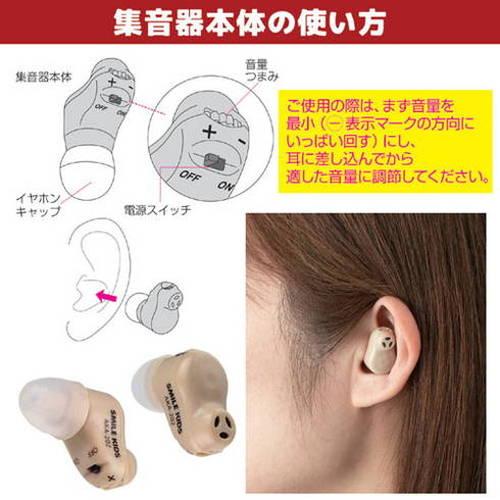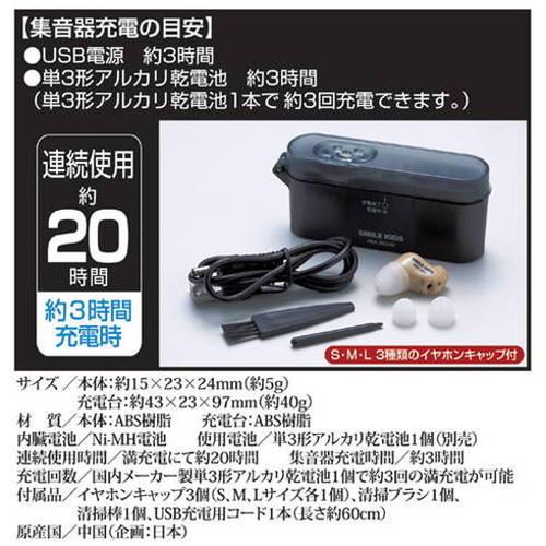ご高齢になると「どうも聞き取りにくい」というお悩みの方も。補聴器ほど大げさなものは要らない・・・という貴方にオススメなのが目立ちにくく小型形状の「充電式耳にすっぽり集音器」です。耳穴にすっぽりとおさまる超小型形状にもかかわらず、しっかりと周囲の音を増幅して聞くことができます。また、本製品は充電式タイプなので、入手しにくいボタン電池・空気電池を用意する必要がありません。充電台に集音器をセットし、アルカリ乾電池もしくはUSB電源から充電することができ、約3時間で満充電状態になります。満充電状態で、約20時間もの連続使用が可能です。電源スイッチも装備してますのでお使いにならない時は電源をオフにすることで内臓電池の消耗も防ぐことができます。音量調節ダイヤル付きで聞き取りやすい範囲で調節できます。イヤホンキャップはサイズもS・M・Lの3タイプがセットされてます。左右両耳兼用タイプです。※内蔵充電池は約500回の充放電が可能、2日に1回の充電で約2年間の使用が可能。※充電台はマンガン乾電池には対応しておりません。必ずアルカリ乾電池をご使用ください。充電時間は約3時間です。単3形アルカリ乾電池1個で、約3回満充電が可能(初回、または完全放電の場合、12時間の充電を推奨します)。