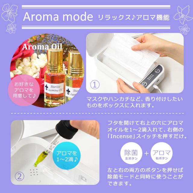 内部左右両側にあるUVCライト(2個)、UVAライト(8個)の紫外線光線により全面除菌ができます。スマートフォンや小物の除菌などに使えます。アロマ機能も搭載しており内部のくぼみにお好みのアロマオイル(別売り)を1〜2滴入れてスマートフォンやマスクなどに香り付けができます。USB給電なのでモバイルバッテリーや車のUSBポートなど外出先などでもご利用いただけます。