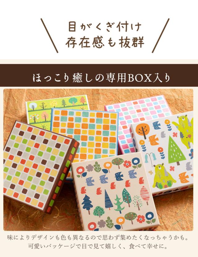 種類ごとに色もデザインも違う可愛い、しっかりとした箱なのでついつい集めたり、 誰かにあげたくなっちゃう♪食べた後には小物入れなどにも使えます。