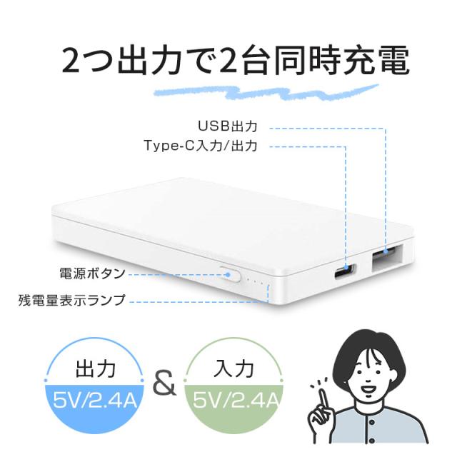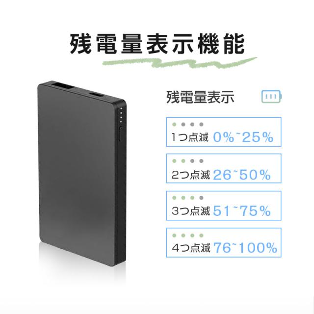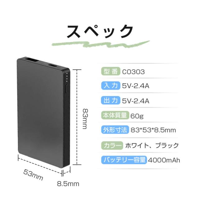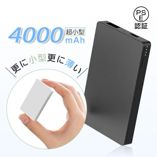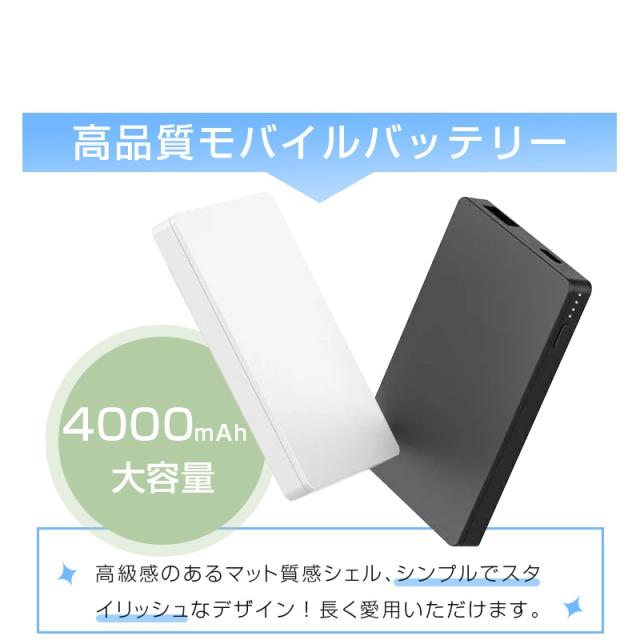 モバイルバッテリー 4000mAh容量 コンパクト スマホ充電器 超薄型 軽量 入力2ポート 急速充電 携帯充電器 防災電源 Type-C 5V/2.4A出力 送料無料 iPhone17/iPhoneAir対応 【PL保険加入済み製品・安心】