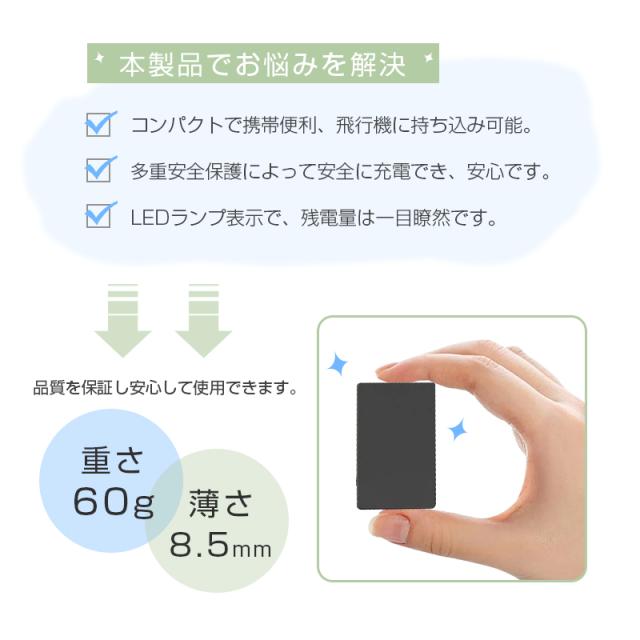 - 荷物が多いのでなるべく軽いバッテリーを探していたところこちらを見つけました。 60gととても軽いので助かってます