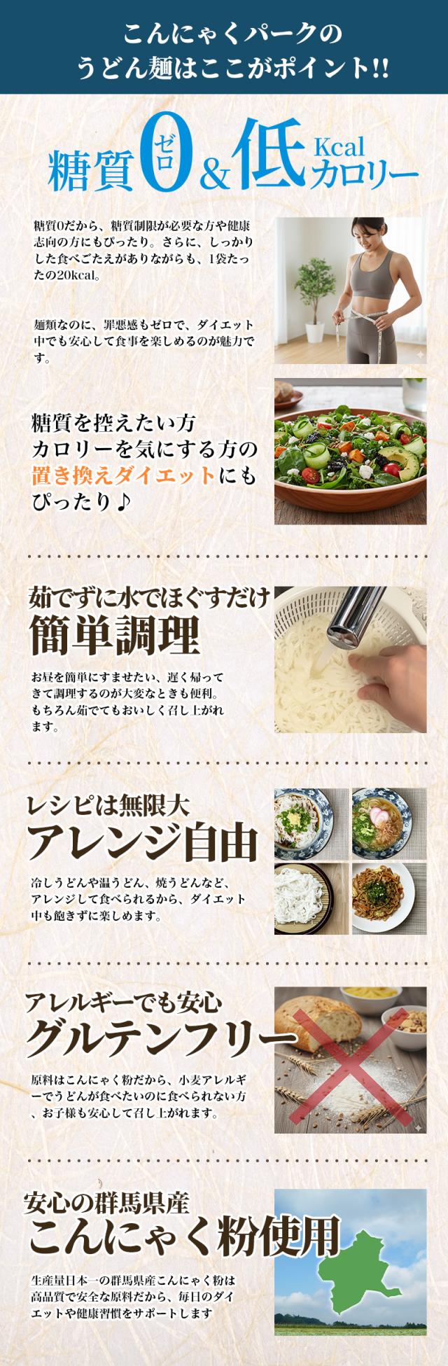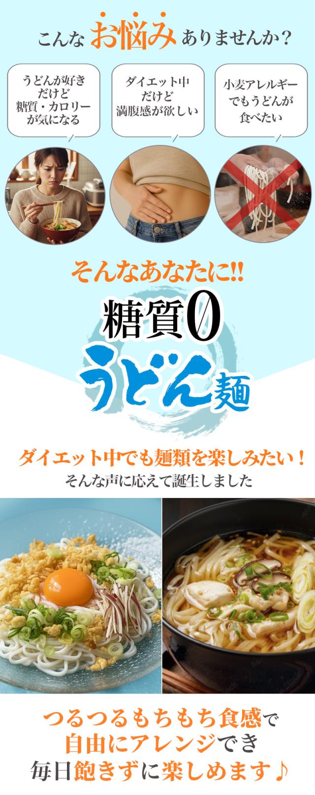 | 糖質0、さらにカロリーも0に近づけました。平打ちをさらに薄くし食感も小麦粉のザクザク感を意識して作り上げました。うどん風の平麺タイプです。 |