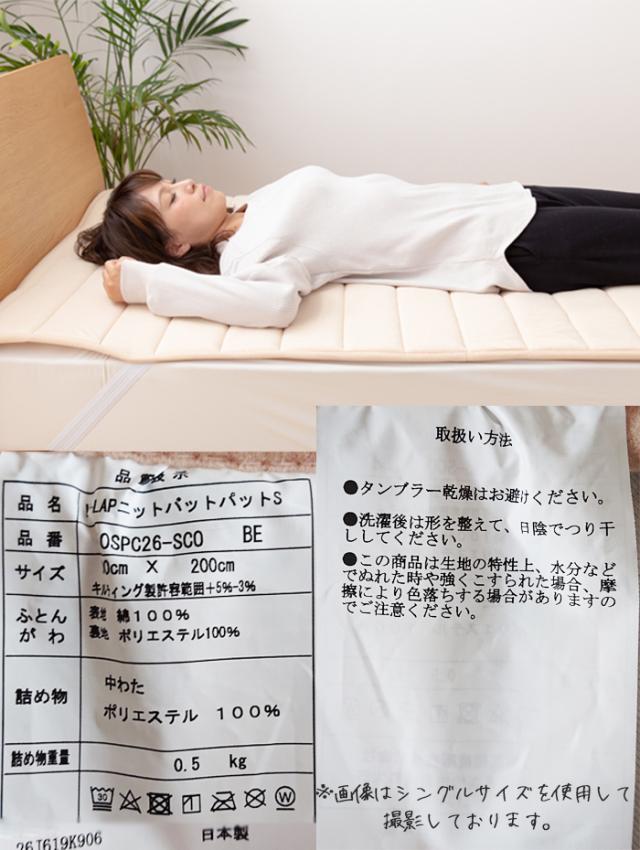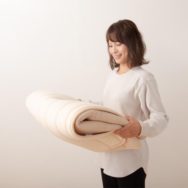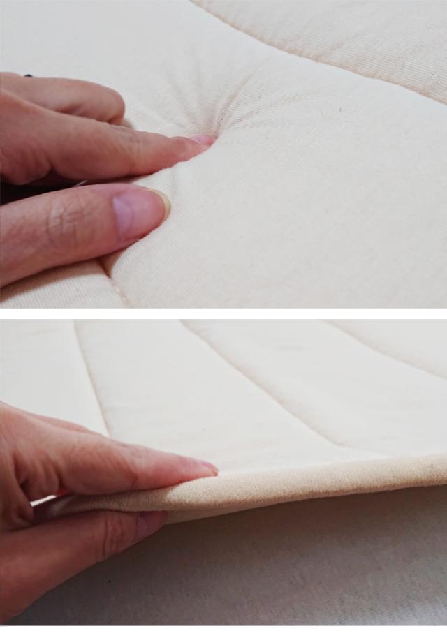 側生地にニット生地を使い、中綿に帝人のブイラップを使用することで敷パッドがもっちり!