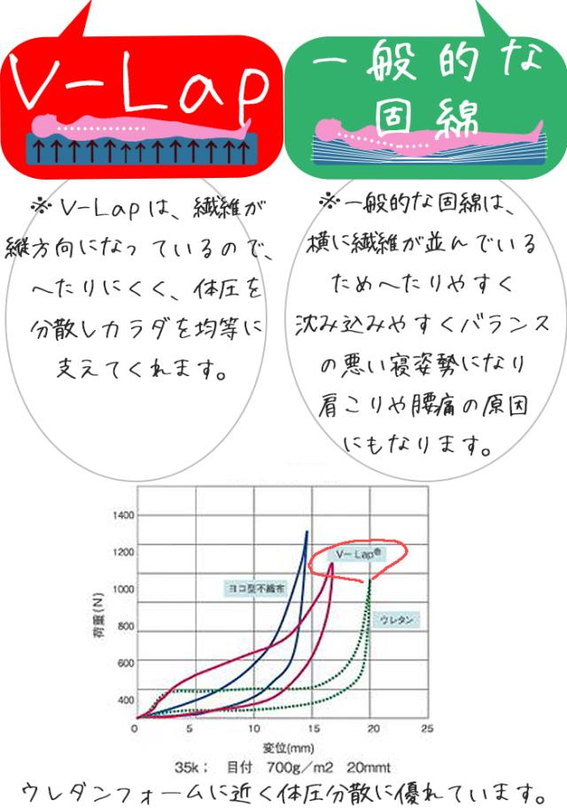 快適繊維クッション材のV-lapは、軽量でへたりにくく高反発性があり体圧分散にも優れているため 睡眠時にかかる体圧をうまく逃がしてくれ肩こりや腰痛の原因を軽減させてくれ快適な寝心地に導いてくれます。