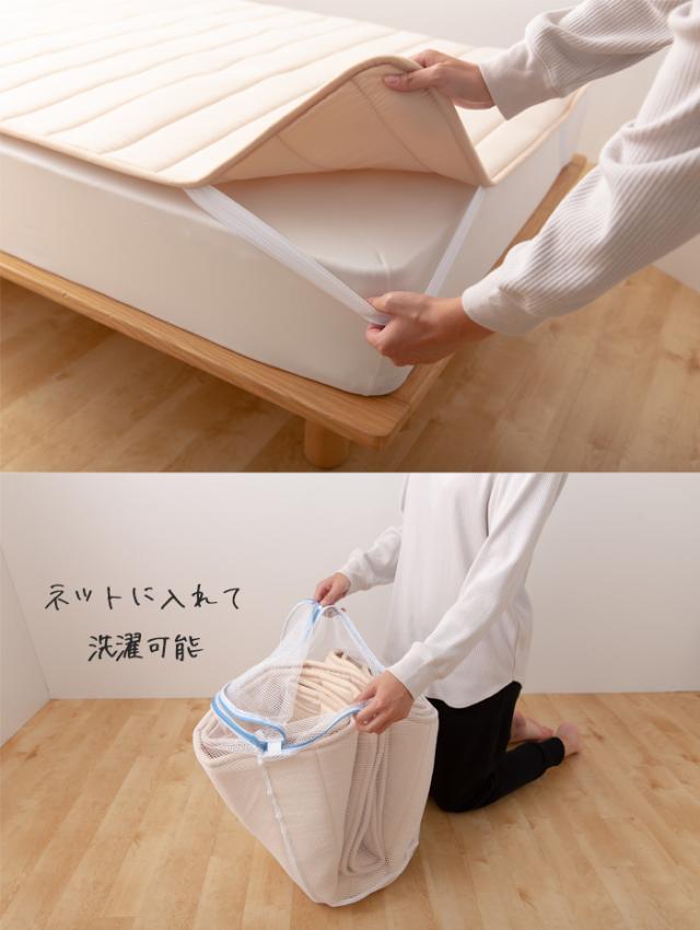 軽く持ち運びも楽でご自宅で洗えるので、気になった時にいつでも丸洗い洗濯可能です。敷パッドの4隅にゴムバンドが付いているのでふとんからのズレを防止します。
