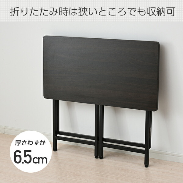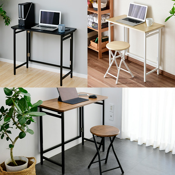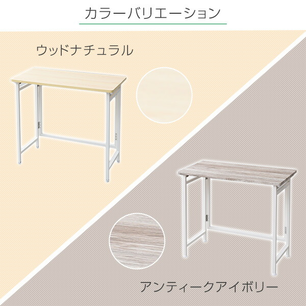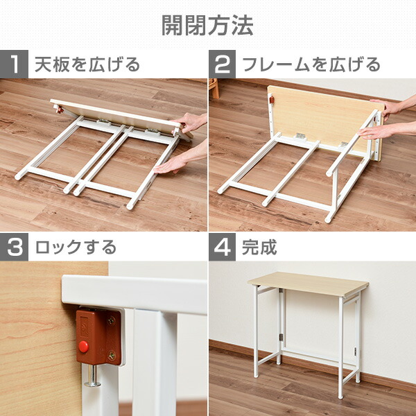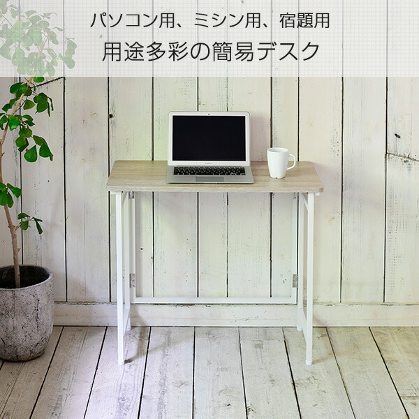 | 商品説明 | ●使うときだけサッと出せるフレーム折りたたみ式デスク ●パソコン用、ミシン用、宿題用、用途多彩の簡易デスク ●折りたたみ時は狭いところでも収納可 ●組立いらずの完成品 ●商品両サイドにあるスイッチを押すだけで、簡単に設置可能 ●アジャスターつきなのでガタつきを押さえられる ●全体耐荷重:20kg ●天板有効寸法:80cm×40cm |