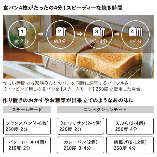 角食パン4枚焼き 加熱モード(スチーム コンベクション ノーマル) 温度調節 タイマー30分