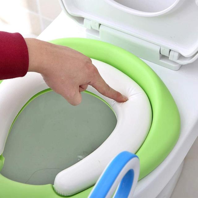 大人用便座を子供用に変えて、小さなお子様にも座りやすいやわらかなクッションの補助便座です。人間工学に基づきデザインされた形で、折りたたんで立てかけておけるので場所を取りません。底部の四角にはすべり止めのクッションと二つのストッパーがあり、安定感があって子供が安心して座ることができて、トイレトレーニングが楽しくなります。