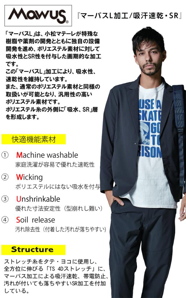 〇マーバスL加工による吸汗速乾、帯電防止、汚れが付いても落ちやすいSR加工を付帯。