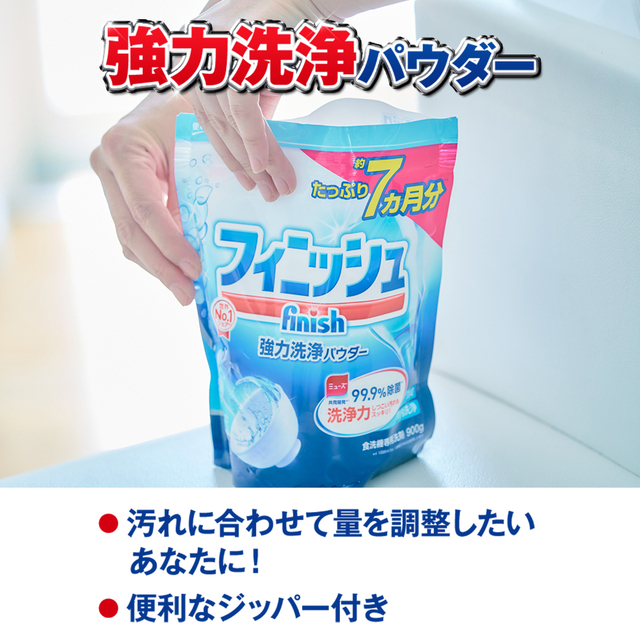 国内食洗機メーカー推奨ブランドNo.1(※1)を誇る食洗機専用洗剤・フィニッシュ。食洗機洗剤ユーザーから求められている洗浄力と安全性(安心)の両方を兼ね備えた、新しいフィニッシュ「パワー&ピュア」。余分な化学成分をカット(※2)しつつ、99.9%除菌(※3)できます。天然由来の重曹を配合。1kg大容量のパウダー詰め替え。(※1)推奨数No.1(2013年レキットベンキーザー・ジャパン調べ)