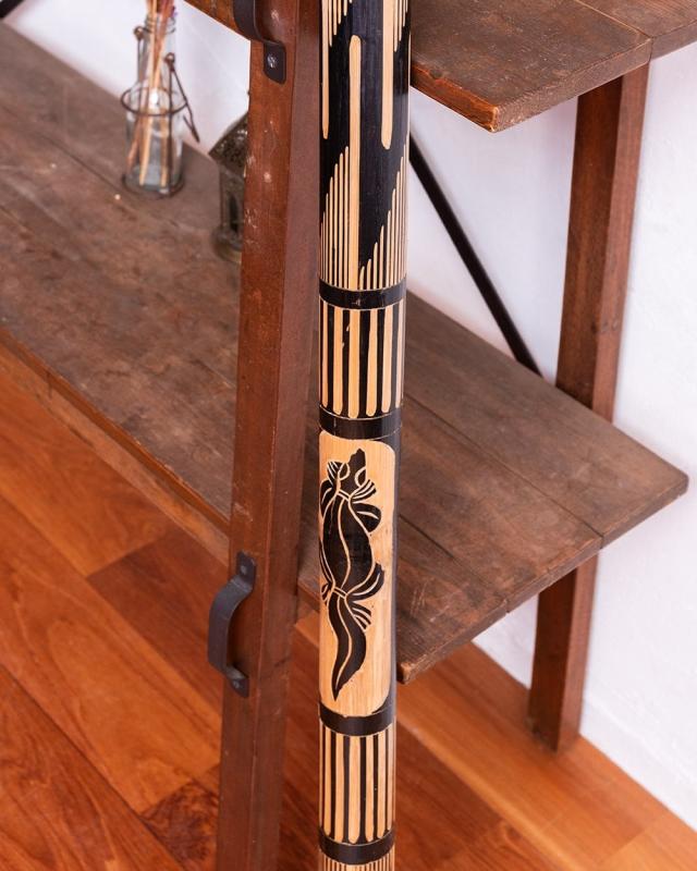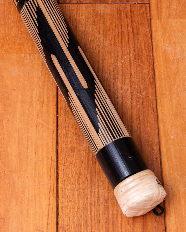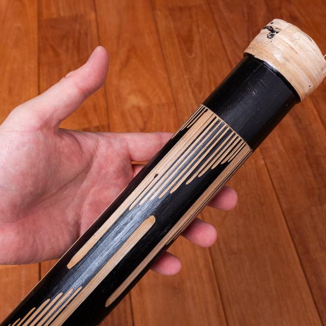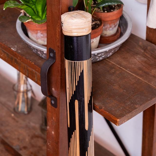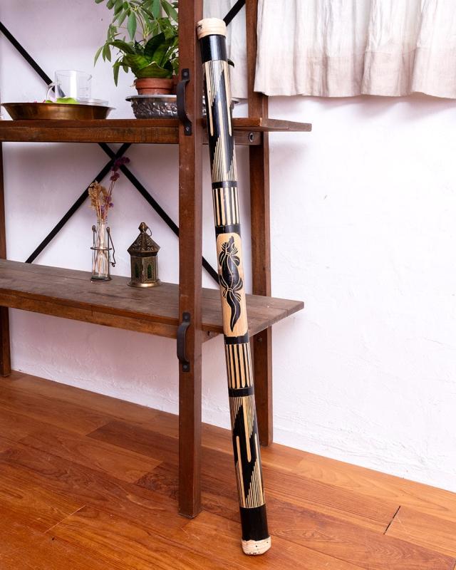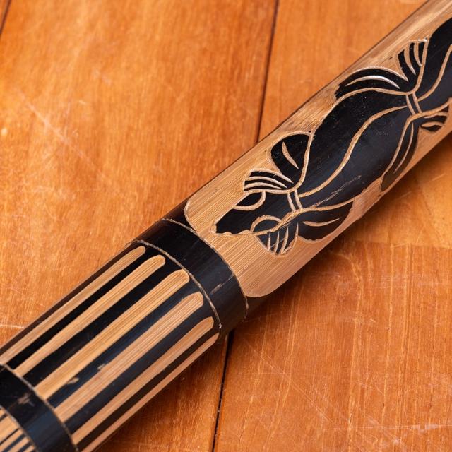 竹の表面を彫って模様を施した、彫刻タイプのレインスティック。削られた部分は竹の地色がそのまま現れ、黒く染められた地とのコントラストがとても美しく、どこか神秘的な印象を与えてくれます。