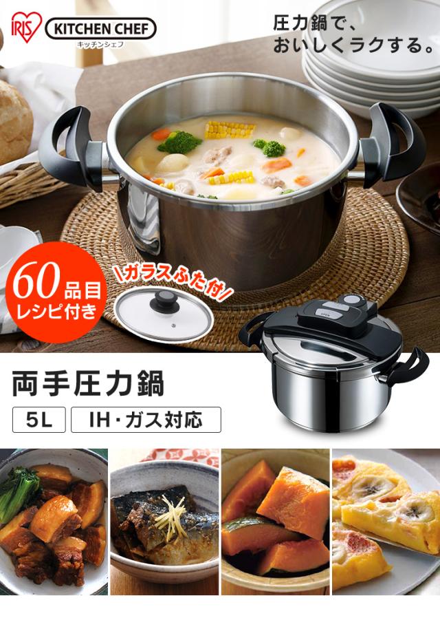 圧力鍋 5.0L IH対応 ガス 内側目盛り付 レシピ ガラス蓋付き 3層底 スライド開閉 圧力2段切替 安全ロック機能 両手鍋 RAN-5L アイリスオーヤマ