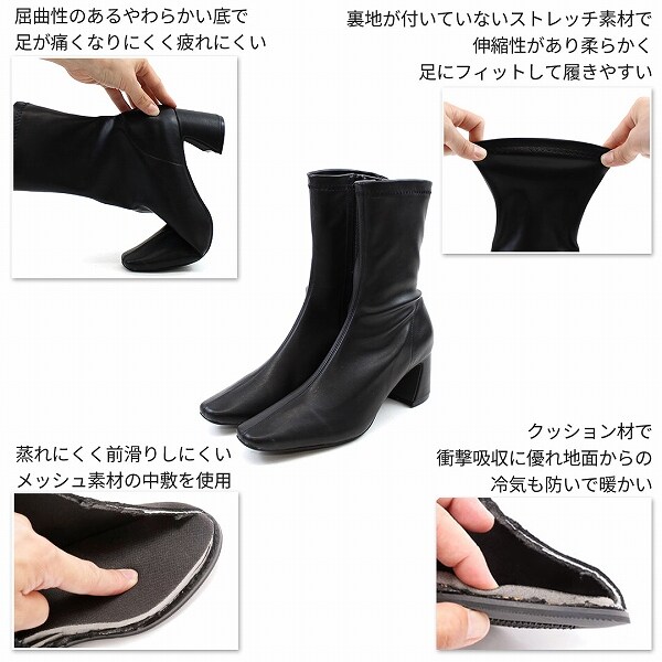 ・裏地が付いていないストレッチ素材で、伸縮性があり柔らかく足にフィットして履きやすい。