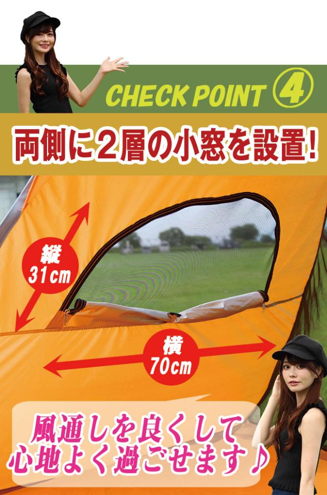 両側面にフライシートとメッシュスクリーンの2重構造窓付き