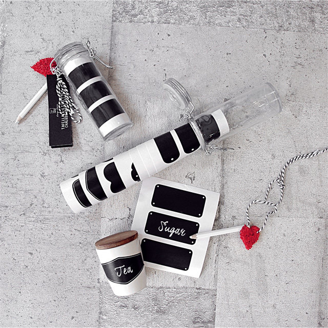 ガラスのキャニスターにロール状のラベルが入っています。