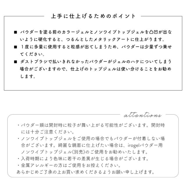 綺麗な鏡面に仕上げたい場合は、irogelパウダー用ノンワイプトップジェル(別売)のご使用をお勧めいたします。