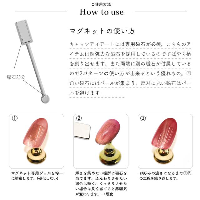 - 購入からしばらくしてやっと使用しました クリアジェルに混ぜたりカラージェルに混ぜたり 普段使わないカラーも沢山ありますが、マグネットにすると使いやすくて色んなカラーに挑戦しやすいです マグネットの動きもそんなに悪くないし可愛いです