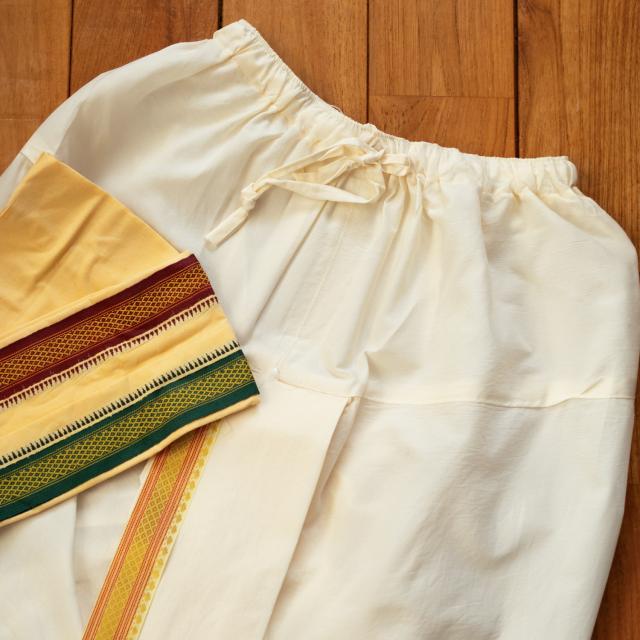 履いてみると意外としっくりくるドーティ。簡単に着こなせるので、パーティーや特別なときにインドの民族衣装を着ておめかしと言うのもいいかもしれません。とっておきの日にお楽しみ下さい。