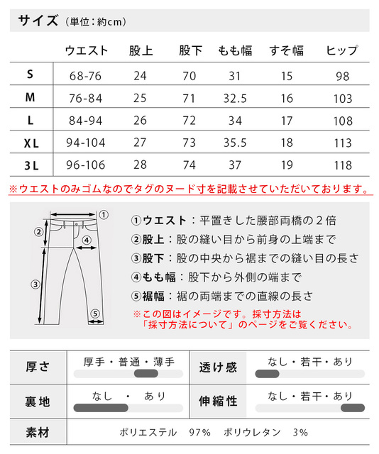 | サイズ | ウエスト | 股上 | 股下 | もも幅 | 裾幅 | ヒップ |